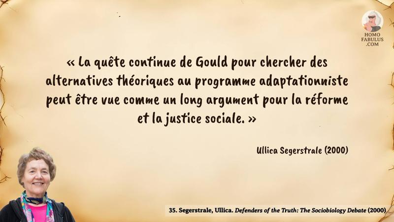 « La quête continue de Gould pour chercher des alternatives théoriques au programme adaptationniste peut être vue comme un long argument pour la réforme et la justice sociale3535. Segerstrale, Ullica. Defenders of the Truth: The Sociobiology Debate (2000).. »