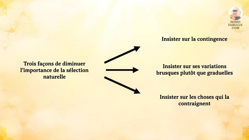 Ce qu’elles ont en commun, c’est qu’elles rabaissent toutes le rôle de la sélection naturelle dans nos explications du vivant5555. Alexander, Richard D. The Biology of Moral Systems. Foundations of human behavior (1987)., 5858. Borgia, Gerald. The Scandals of San Marco. The Quarterly Review of Biology (1994)., 6161. Queller, David C.. The Spaniels of St. Marx and the Panglossian Paradox: A Critique of a Rhetorical Programme. The Quarterly Review of Biology (1995)., 6363. Dennett, Daniel C.. Darwin’s Dangerous Idea – Evolution and the Meanings of Life (1995)., 3535. Segerstrale, Ullica. Defenders of the Truth: The Sociobiology Debate (2000).. Dire que les êtres vivants sont le résultat d’événements aléatoires qui auraient tout aussi bien pu ne pas avoir lieu, dire que l’évolution est très rapide sur des périodes courtes plutôt que graduelle sur des périodes longues, et dire que la sélection naturelle a les mains liées par des contraintes évolutives, ça revient à dire que la sélection naturelle n’est pas si importante que ça au final pour nous permettre de comprendre le vivant [Schéma 3].